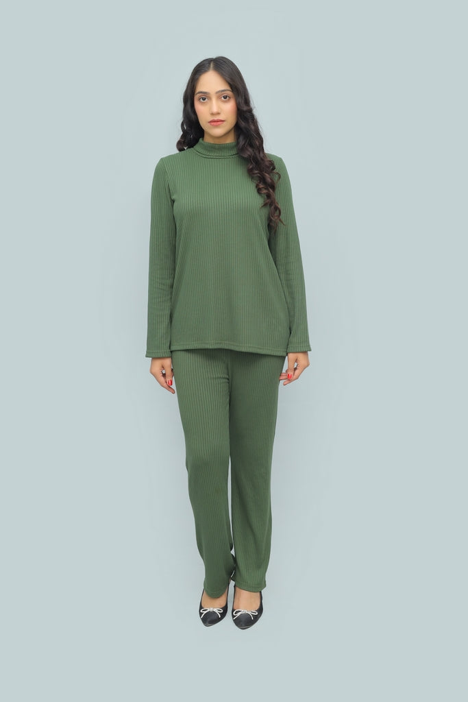 Crafted from premium drop-needle ribbed fabric, this elegant co-ord from Celora.pk’s Winter Collection pairs a high-neck top with side slits and fitted trousers to create a silhouette that’s both refined and effortlessly cozy. The deep forest green tone adds depth and sophistication — perfect for elevated lounging or relaxed winter elegance.
